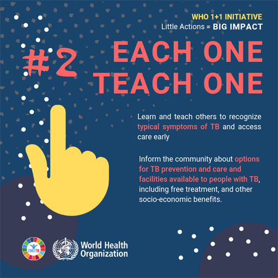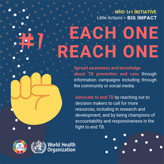 To address this, in 2019, WHO launched a special youth initiative titled 1+1- to call for youth mobilization to boost the fight to end TB. The initiative aims at advancing engagement with young people and amplifying their voices to end TB. Youth can have a multiplier effect in the fight to end TB, to accelerate progress towards reaching the ambitious 2022 targets of the UN high-level meeting on ending TB, as well as the larger goal of ending TB by 2030, as included in the WHO End TB Strategy and the SDGs. This was followed by a Global Youth Townhall to end TB that culminated in a Youth Declaration to End TB. WHO is working with young people around the world to strengthen their engagement and implement the declaration.