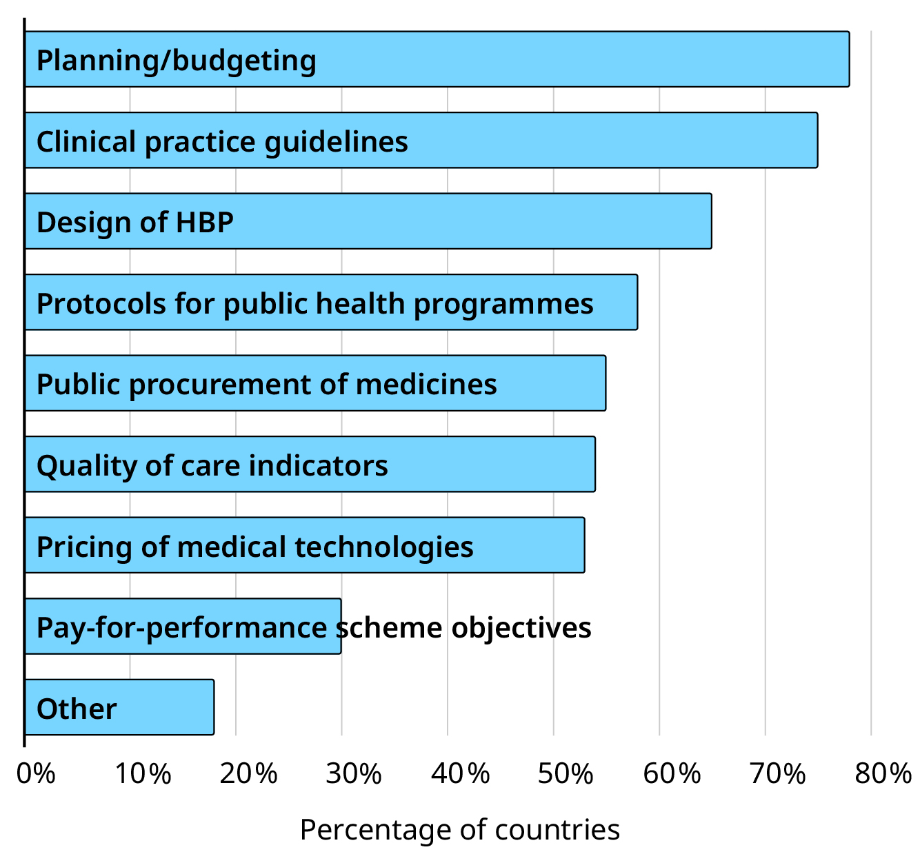 The top three functions for a health decision-making process were: planning/budgeting (78% of countries and areas), clinical practice guidelines (75% of countries and areas), and design of health benefit packages (65% of countries and areas).