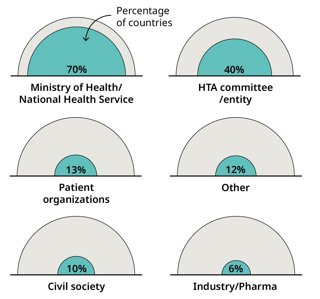 Understanding which stakeholders are involved and where this takes place can be critical for developing fair decision-making processes that account for multiple voices. For selecting priorities and nominating interventions, most respondents (66%) said that this was done by the Ministry/Department of Health or National Health Service, with the second most common choice being the HTA committee.