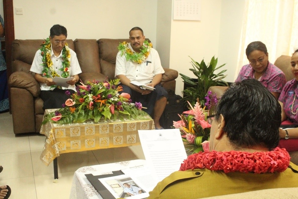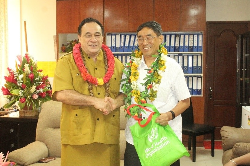 The Honourable Valasi Toogamaga Tafito Selesele and Dr. Baoping Yang, WHO Officer-in-Charge exchange greetings