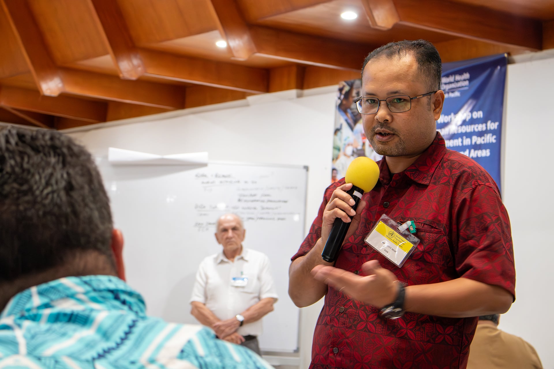 Mr Scott Mori (right), Chief Operating Officer of FSM’s Department of Health and Social Affairs, speaks during the Strategic Human Resources for Health Workshop held in Nadi, Fiji on 30 October to 3 November 2023. Photo: WHO/Faizza Tanggol