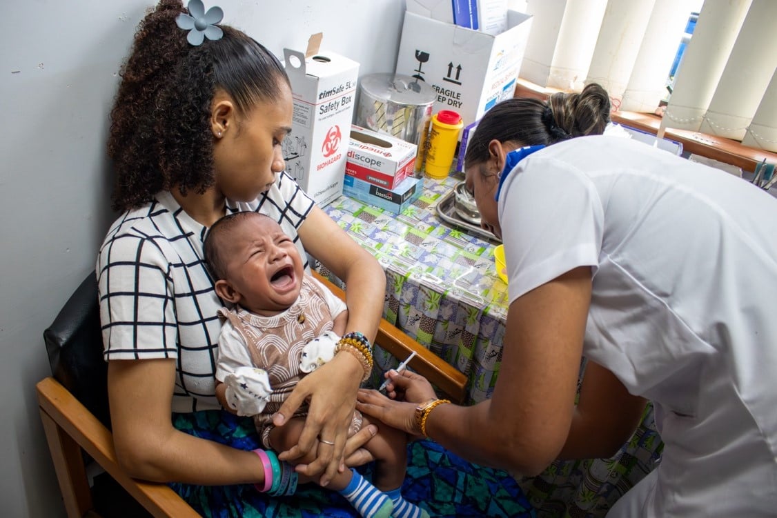Amidst the quiet buzz of activity at Suva Health Clinic, a baby’s cry punches through, signalling the completion of a series of vaccines administered to 2-month-old Josaia. His mum, Sainimili, quickly soothes Josaia by kissing and hugging him a little more tightly. Josaia’s cry quickly settles, and another young life is protected through vaccination.