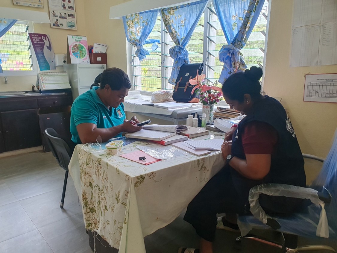 WHO’s Ranjila Devi (right) with staff nurse Alesi during a supportive supervision visit at Nasau Health Centre in Rakiraki, Fiji. Photo: WHO/Misbah Harun