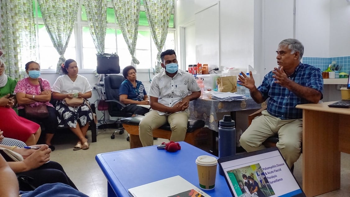 Dr Md Shafiqul Hossain (right), Technical Officer for Vaccine-Preventable Diseases and Immunization at WHO’s South Pacific office, speaks during a hands-on training conducted by WHO and Ministry of Health on polio and acute flaccid paralysis surveillance, to help strengthen polio eradication efforts in Fiji. Photo: WHO/Petueli Tui