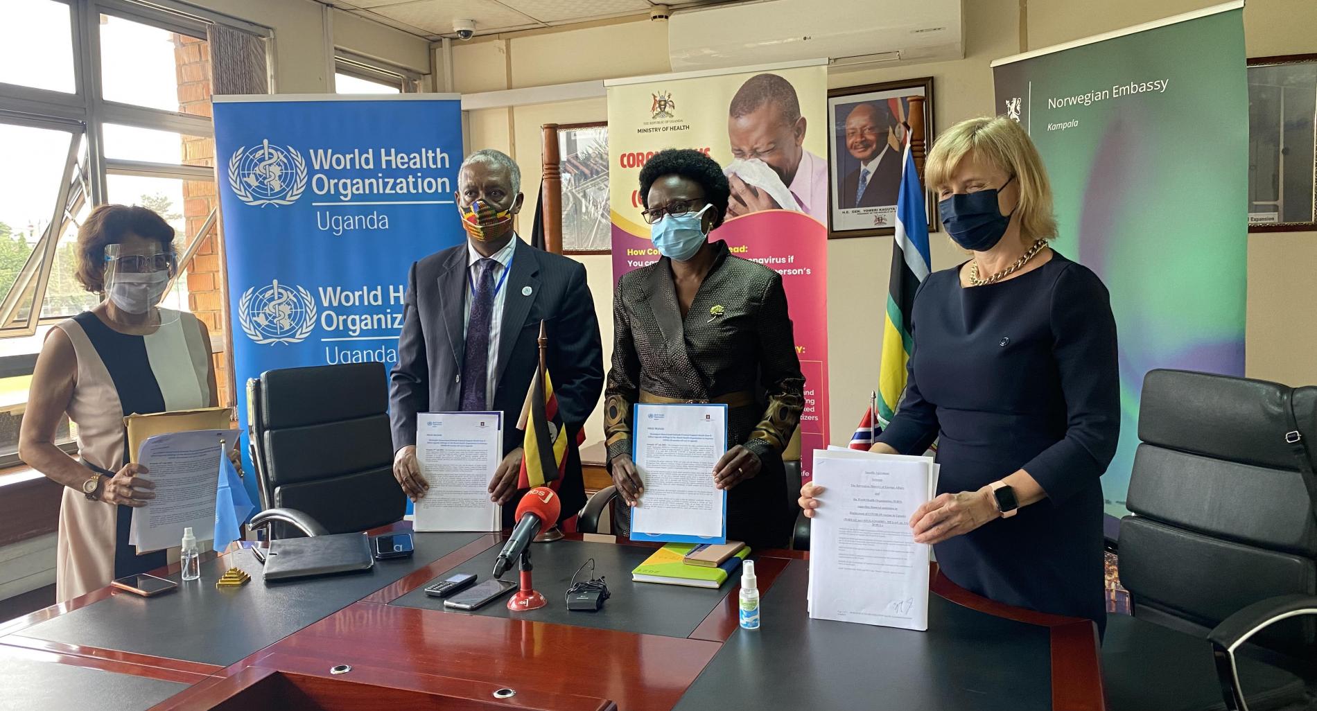 From left: WHO Representative to Uganda Dr Yonas Tegegn Woldemariam, Minister of Health Honourable Dr Jane Ruth Aceng and Norwegian Ambassador to Uganda H.E. Elin Østebø Johansen upon signing the agreement