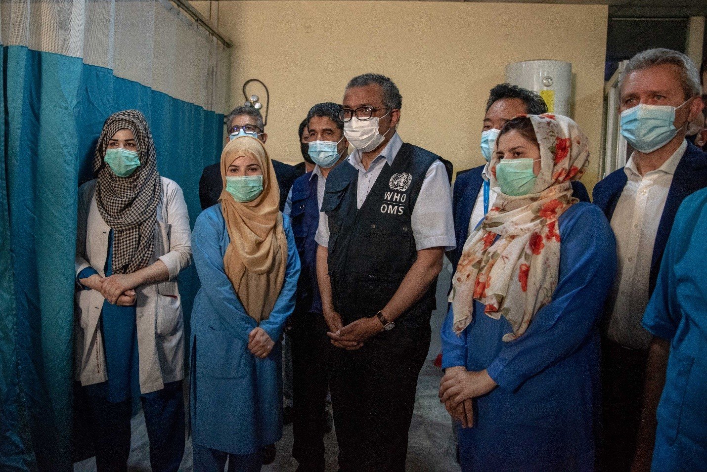 WHO Director-General Dr Tedros (centre), WHO Regional Director for the Eastern Mediterranean, Dr Ahmed Al-Mandhari (centre left), and WHO Representative in Afghanistan Dr Luo Dapeng (centre right) stand together with nurses at the Wazir Mohammad Akbar Khan National Hospital in Kabul, Afghanistan, September 2021