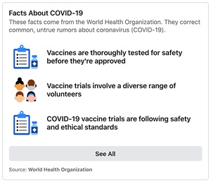 Facebook has also directed billions of people globally to resources from the WHO and other health authorities through their COVID-19 Information Center and informative pop-ups on Facebook and Instagram, with hundreds of millions clicking through to learn more from trusted sources.