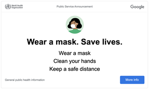 WHO’s essential guidance and public health recommendations have been able to reach new global audiences thanks to pro-bono public service announcement (PSA) and advertising space across television, search engines and social media channels. To date, Ads linking people to critical health information on Google, YouTube and Facebook alone have reached billions of people around the world.