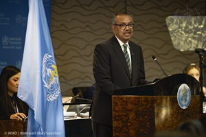 WHO Director-General Dr Tedros Adhanom Ghebreyesus addresses the World Health Organization Regional Committee for the Western Pacific during the opening session on 16 October 2023 in Manila, Philippines.