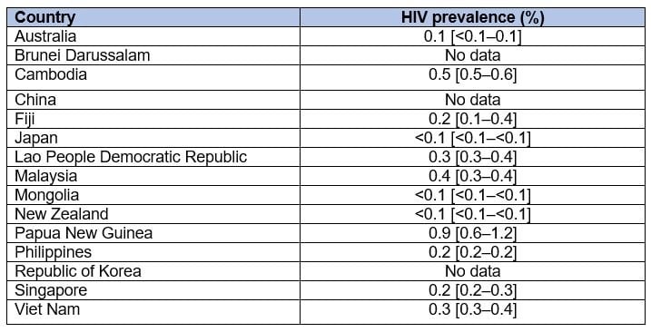Estimated global HIV prevalence was 0.7% [0.6–0.9] while regional prevalence in the Western Pacific was 0.1% [0.1–0.2].