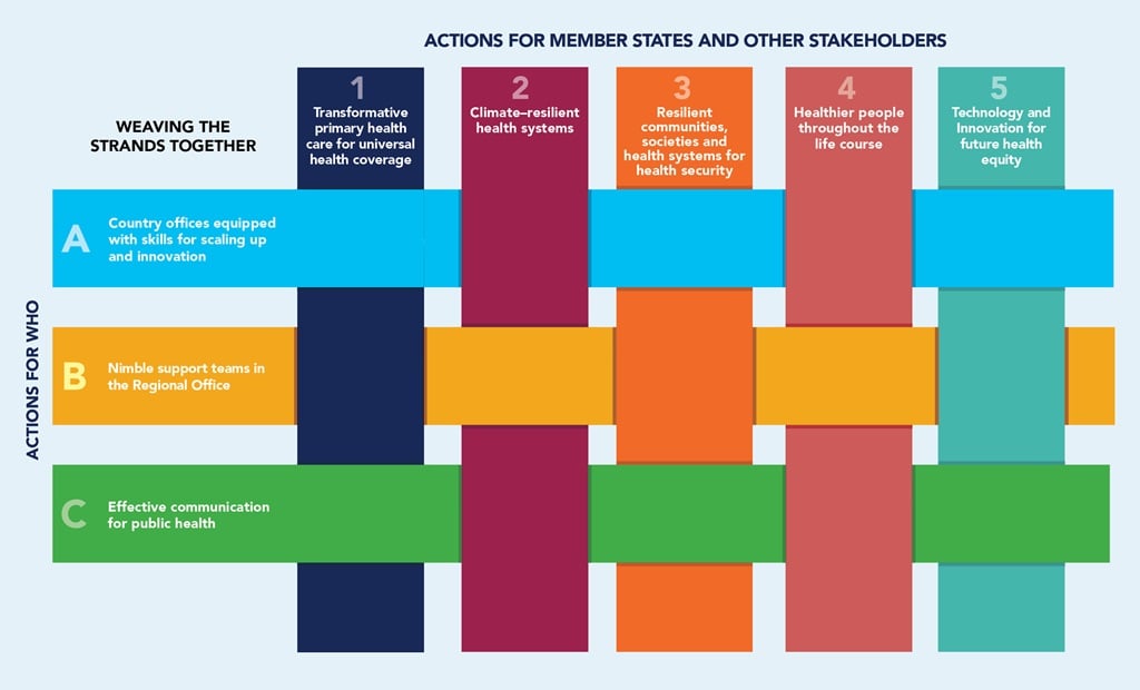 This new vision builds on the achievements of the For the Future vision. It is also aligned with the global WHO Fourteenth General Programme of Work, 2025−2028, and country cooperation strategies, collectively bring together our knowledge, wisdom, cultures and experiences to weave a mat of health that will serve the Region’s countries and areas while also strengthening the WHO workforce, promoting a positive workplace and encouraging a community of learning and service to meet the new challenges for public health.